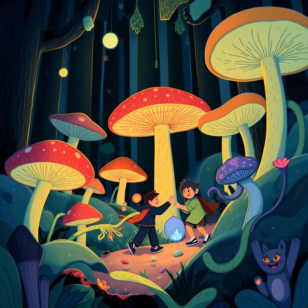 After solving the riddles, they ventured into a dark forest where glowing mushrooms lit the way and enchanted vines tried to play tricks on them.