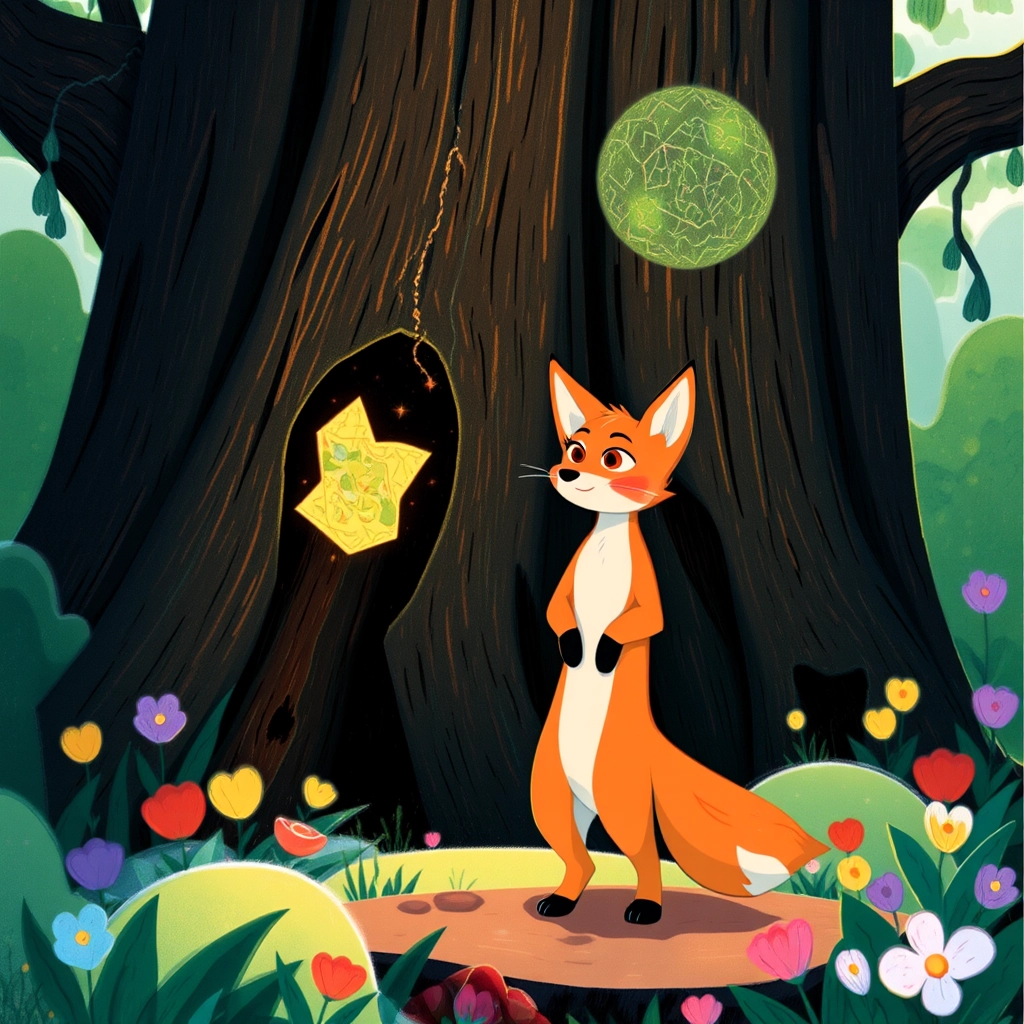 One day, [Ellie the Fox](7PJPCCMN) with her bright orange fur and bushy tail discovered a glowing map stuck in the bark of an old tree.