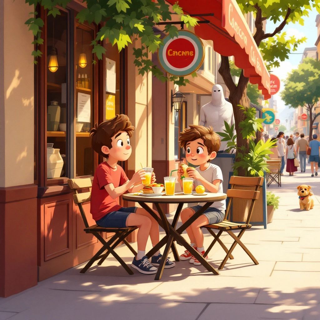 Feeling a bit hungry, they stopped at a charming café with outdoor seating. They ordered delicious sandwiches and lemonade, and watched as people strolled by with their dogs.