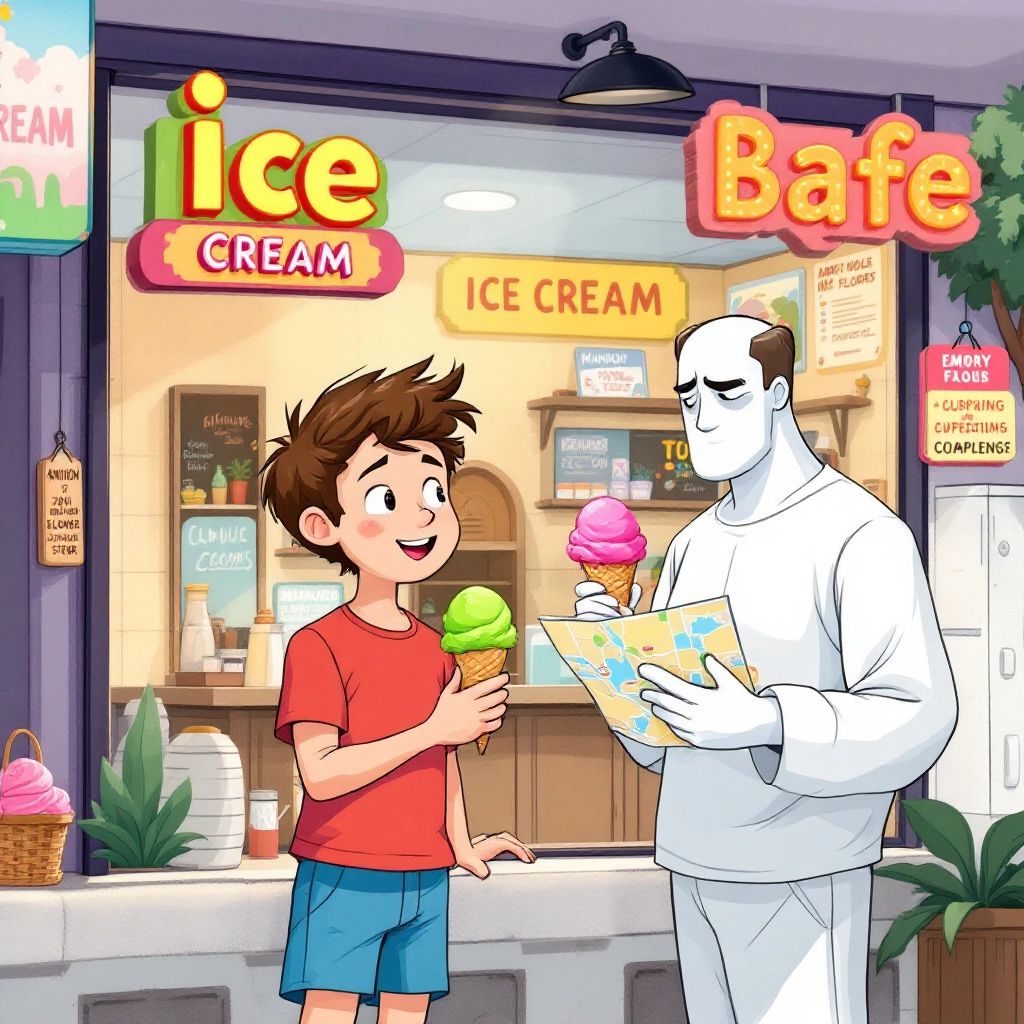[Emory](LKHLQJZS) and [Mihailo](R5QKZ7TP) couldn't resist stopping by a famous ice cream shop, known for its unusual flavors. They each got a cone and continued their adventure with smiles on their faces.