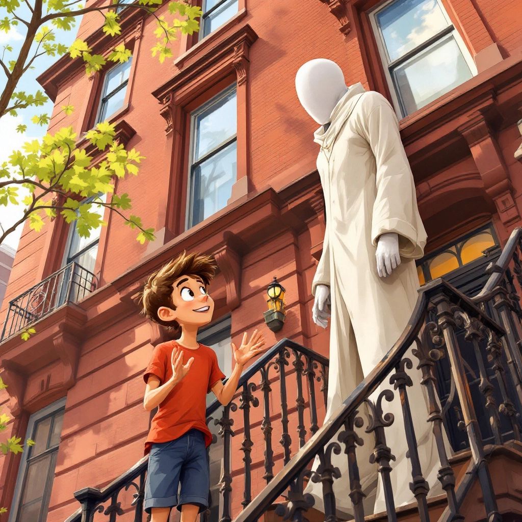 On their way back, they walked past a historic brownstone building. [Mihailo](R5QKZ7TP) shared fascinating stories about its past, keeping [Emory](LKHLQJZS) intrigued.