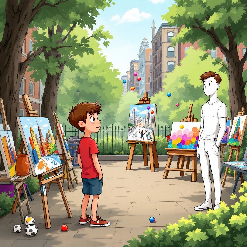 Next, they wandered into a small park where artists were displaying their vibrant paintings. [Mihailo](R5QKZ7TP) admired a piece that captured the energy of New York perfectly.