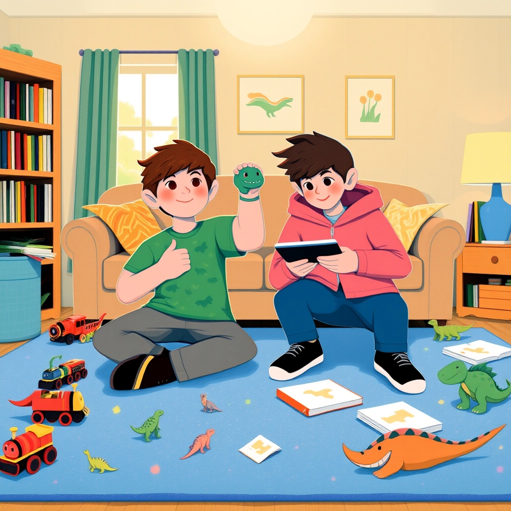 [Brooklyn](B3SD4H5C) and [Rory](YS6J9FF5) sat together in their living room. [Brooklyn](B3SD4H5C) pointed at his trusty toy dinosaur, while [Rory](YS6J9FF5) held his favorite tablet. "Let’s go on an adventure!" [Rory](YS6J9FF5) said with a big smile, leaning toward his brother.