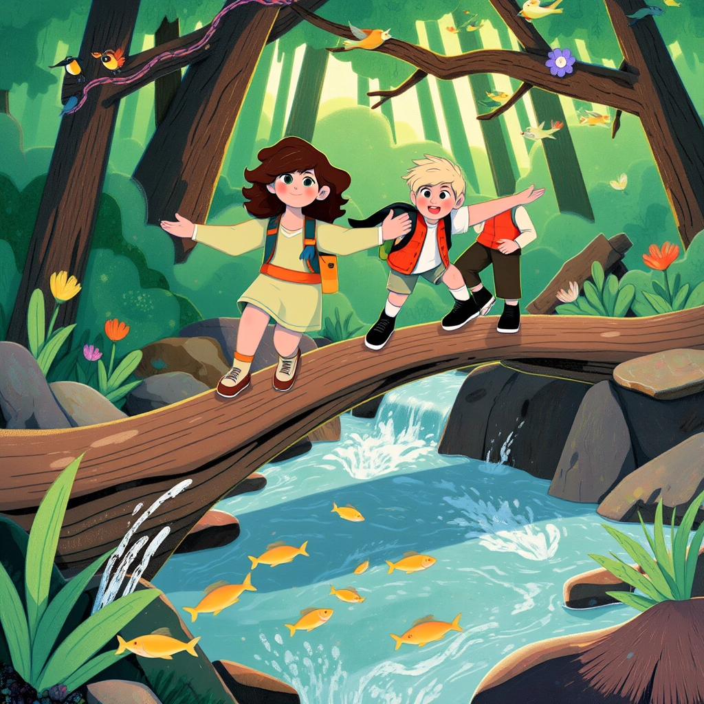 Following the map, they crossed a wobbly wooden bridge and giggled as the planks creaked beneath their feet.