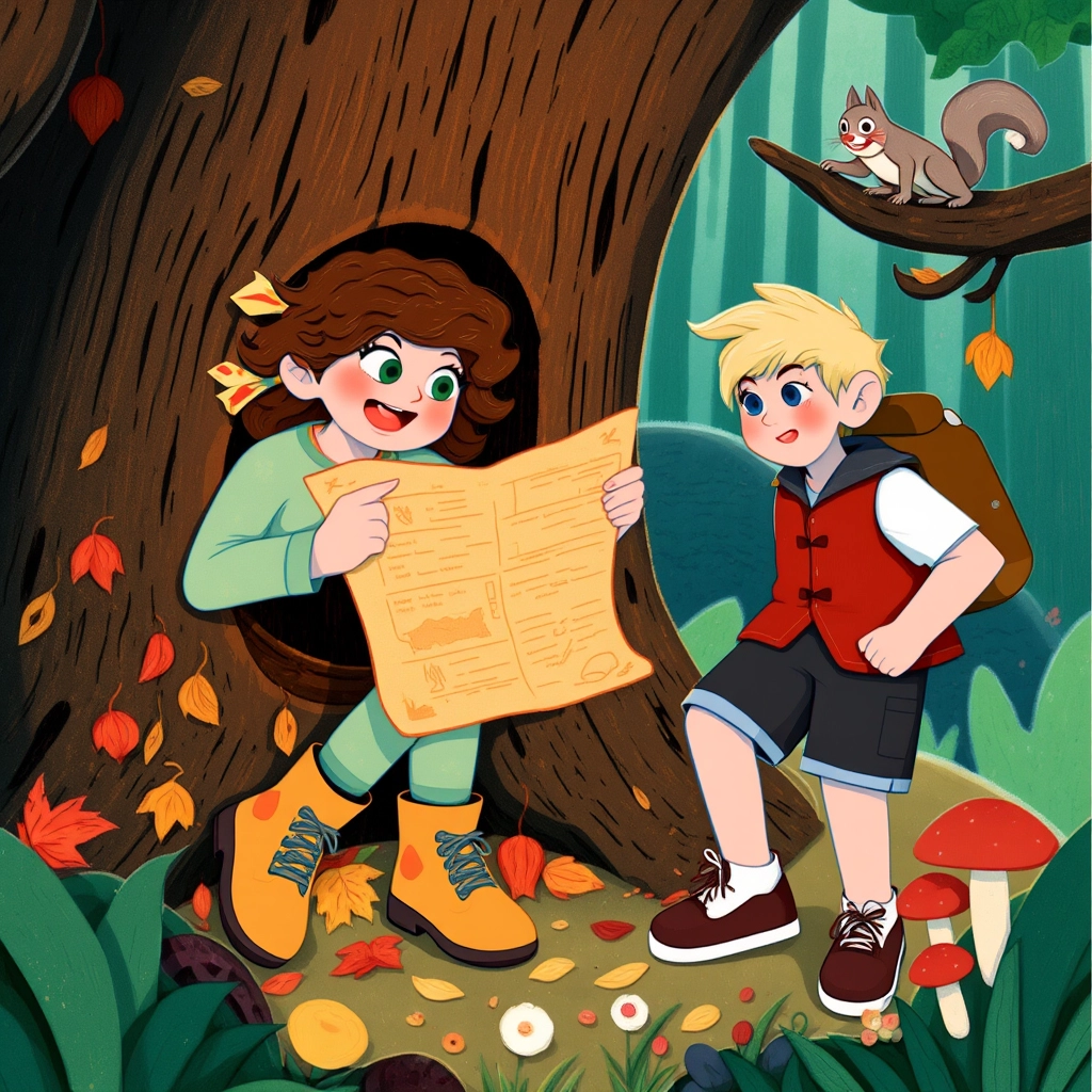 One morning, they discovered a curious map tucked inside a tree hollow. It had a big red 'X' marked on it. What could it lead to?