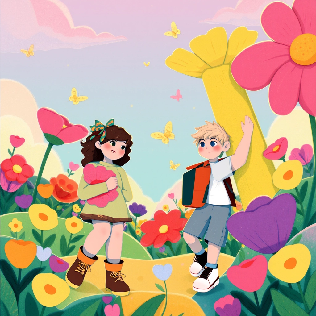 They soon came to a field of giant flowers. Each flower was as tall as a tree and smelled like candy!