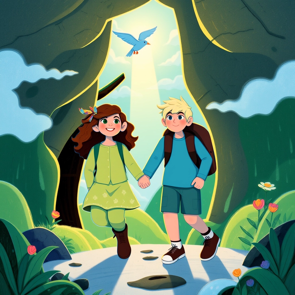 As they left the cave, the blue bird chirped goodbye and flew into the sky. They couldn’t wait for their next adventure!