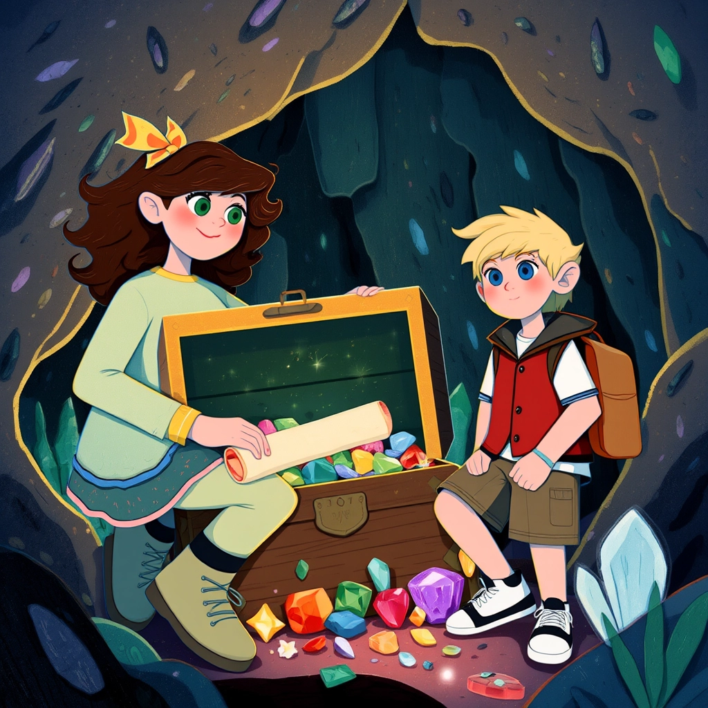 Inside, they found a treasure chest! When they opened it, they saw shiny stones, colorful gems, and… a note.