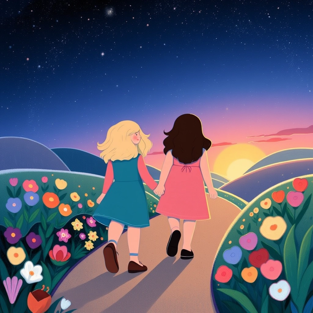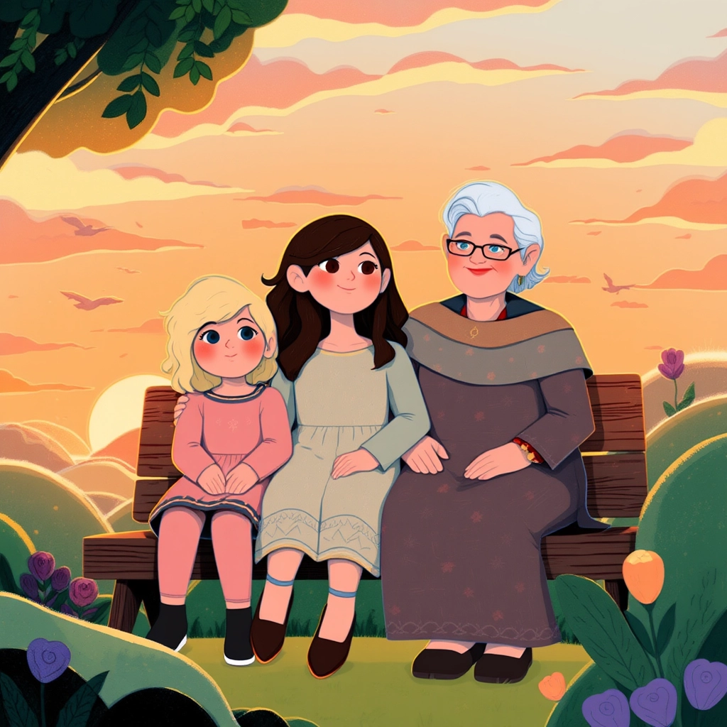 As the sun began to set, the garden glowed softly. [Maria](RF2Q3JQQ) and [Aria](YZSR4RGK) felt so lucky to have such a loving family.