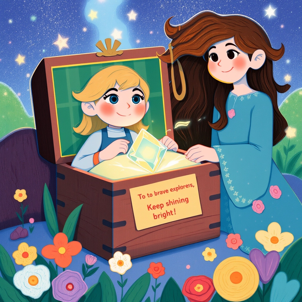 Click! Inside the box, they found a small note and a glittering gemstone. The note said, 'To the brave explorers, keep shining bright!'