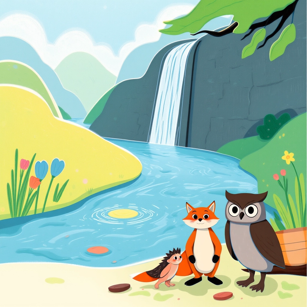 One sunny morning, they noticed something unusual: the sparkling river was turning grey! The friends gathered by the riverbank, their reflections shimmering faintly in the water, worrying about what might be causing this.