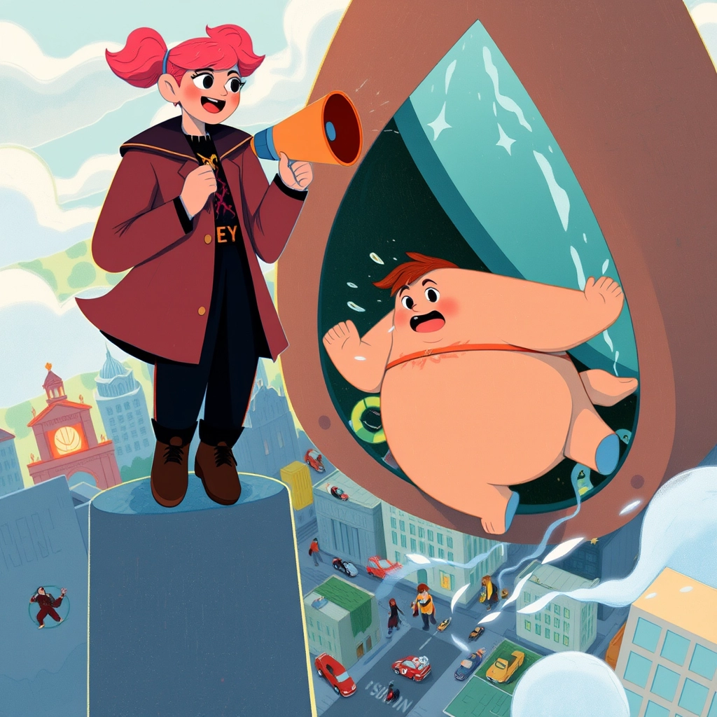 Deep in the fantastical Pine Spine City, the unique laws of 'The World of Tears' made life strange but manageable. Here, drinking more than a sip of water turned people chubby beyond belief! Yet, everyone lived in harmony, sipping water cautiously with tiny spoons. That is, until the tourists arrived.