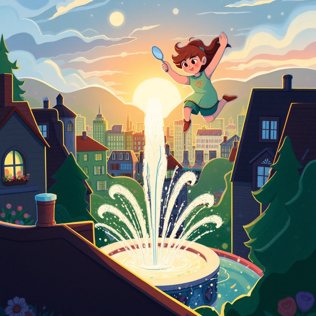 Zoey knew she had to act fast. She spotted a neighboring fountain with sparkling drops. Using her agility, she leapt rooftop to rooftop and grabbed a spoonful of water from the fountain.