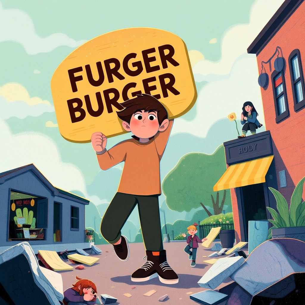 [Sam](JN3J6BVY) noticed a giant burger sign on a nearby shop. Thinking it was real, he picked it up and bit into it. 'Ewww! Why is this burger rubber?' he groaned, tossing it aside. The chaos continued.
