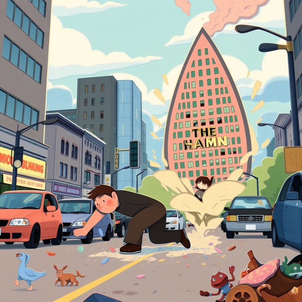 [Sam](JN3J6BVY), now the size of a skyscraper, lost control. Crawling like a baby, he squished cars as if they were cans and accidentally toppled a building with his enormous hand. The city faced utter chaos!