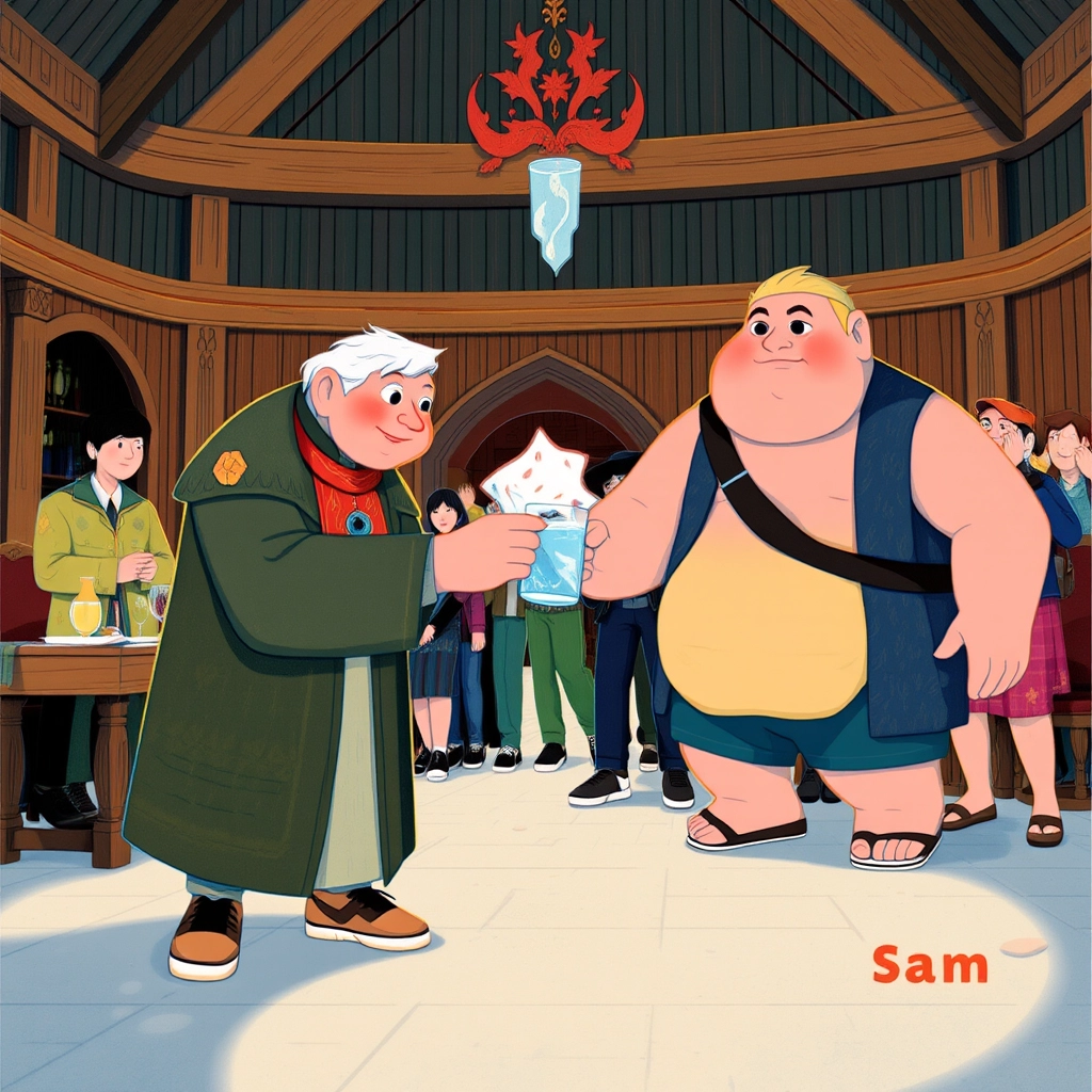 The Mayor greeted the tourists warmly, offering them water. [Sam](JN3J6BVY) eagerly took his spoonful, but one sip was not enough. Against the Mayor's warnings, he gulped and gulped until it was too late.