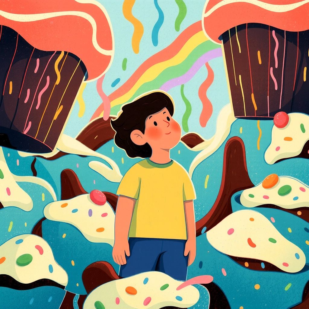 Everywhere [Ahmet](D59WG7TZ) looked, there were towering cupcakes as big as trees. Each one was a different flavor and color, topped with creamy swirls and sugary sprinkles that glittered in the sunlight.