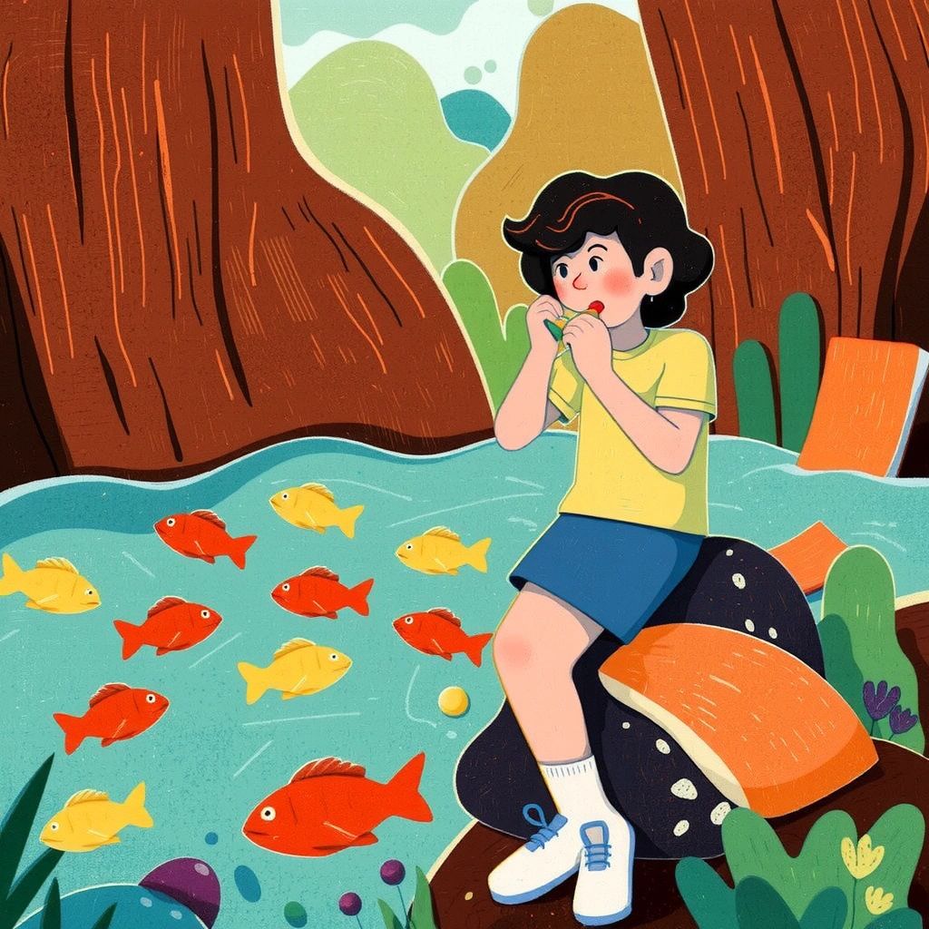 Next, they visited the River of Chocolate, where gummy fish jumped playfully. [Ahmet](D59WG7TZ) tasted the smooth chocolate and declared it the richest he had ever enjoyed!
