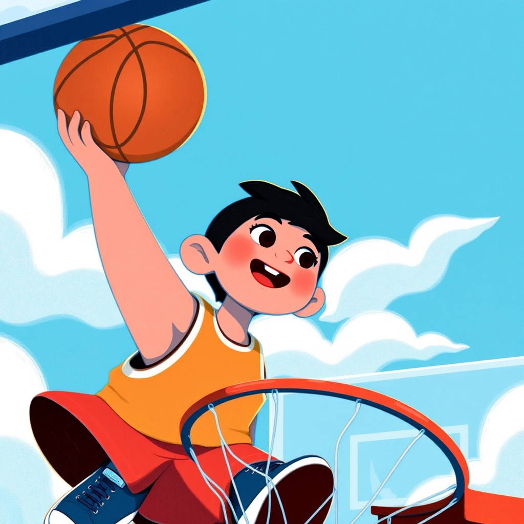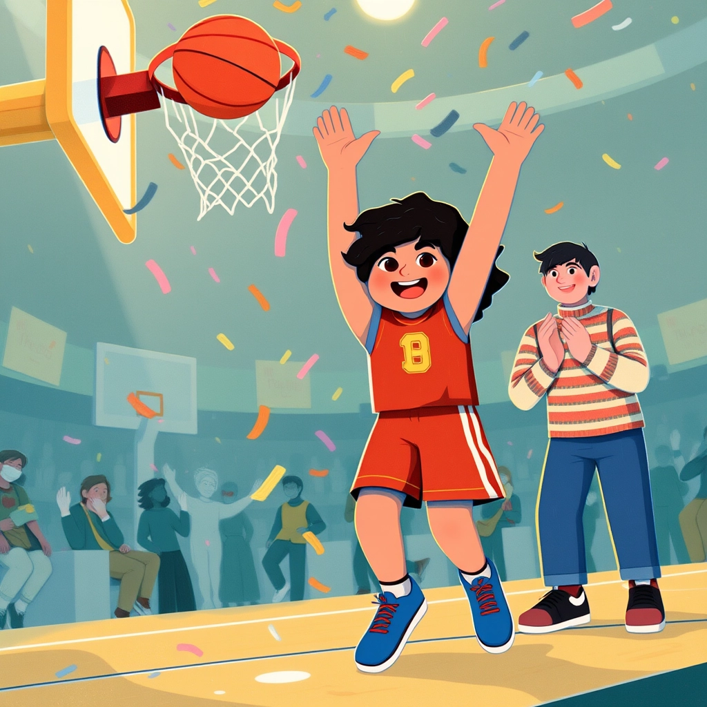 Then, it was time for the big shot! [Aidon](2J4KQ5NG) aimed carefully at the hoop, his heart beating fast. With all his strength, he threw the ball up in the air…
