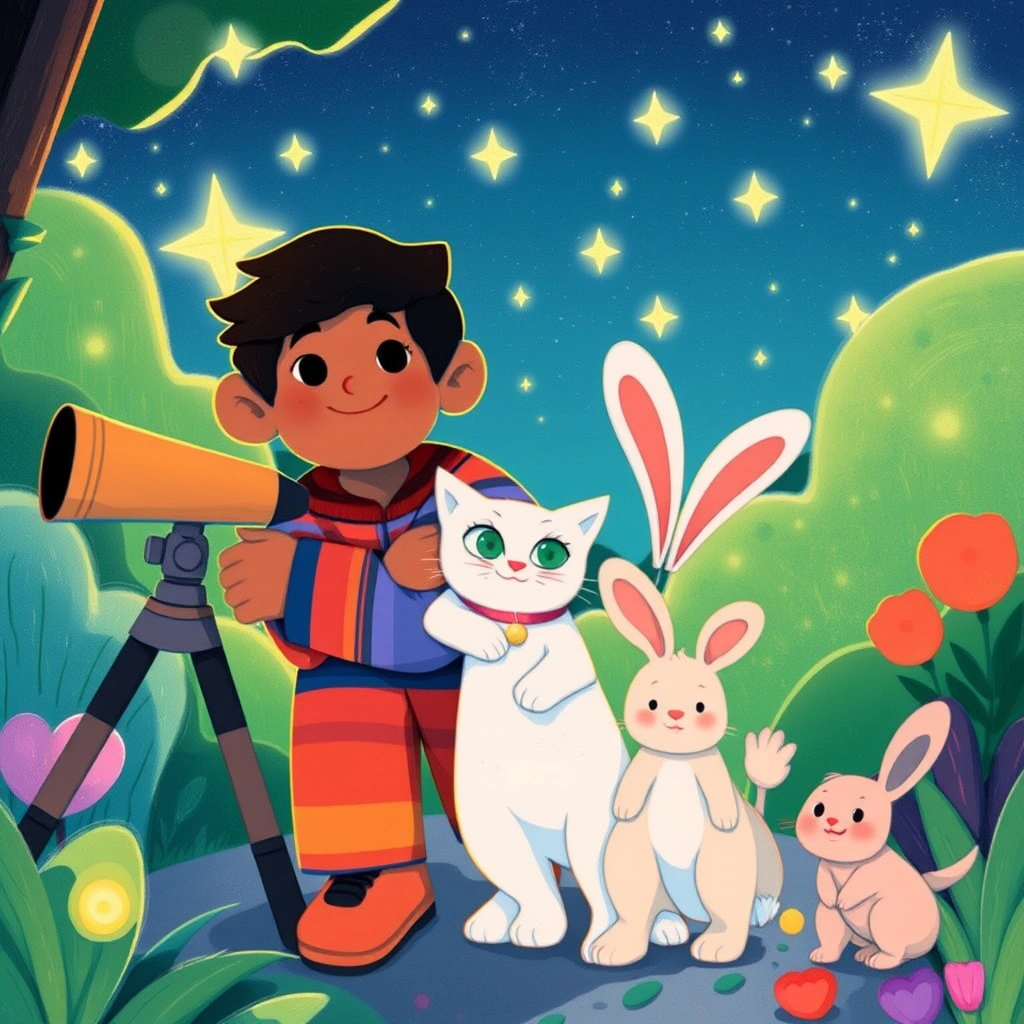 Downstairs, [Akash](D9H2LNTL) saw his best friends, [Mia](5HQLRDRN) the cat and [Rani](WF5PDXR6) the bunny, waiting for him.