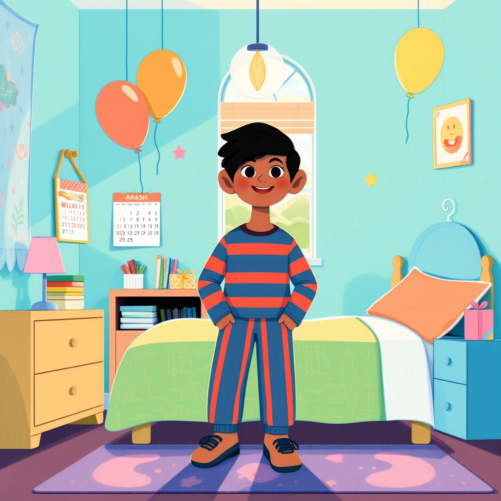 [Akash](D9H2LNTL) woke up with a big smile. 'Today is my birthday!' he exclaimed, jumping out of bed.