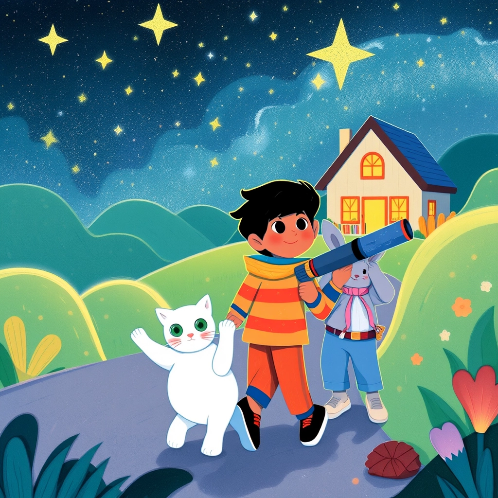 'Let’s explore the skies!' said [Akash](D9H2LNTL). They went outside to try the telescope.