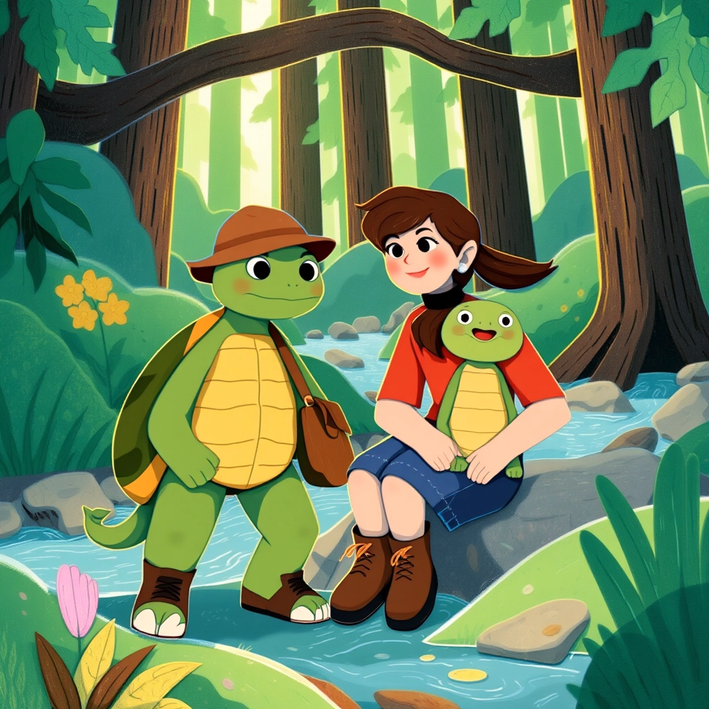 While following the stream, [Alanah](YGWTYZVM) met a kind turtle named Timmy, who wore a little hat and carried a small satchel.