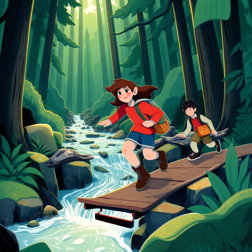 Using the map, they ventured deeper into the forest, climbing rocks and crossing a rickety bridge.