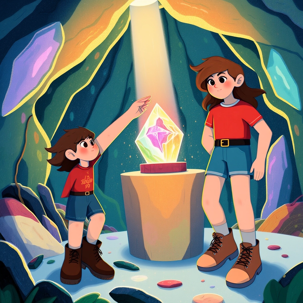 Finally, they found the cave. It was dark and sparkly, with glowing crystals lighting their path.