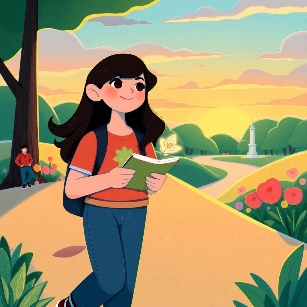 [Aleen](T3MDRFT2) set off to find the answer. She walked to the hill where the town's park stood. The park was full of children, laughter, and flowers of every color.