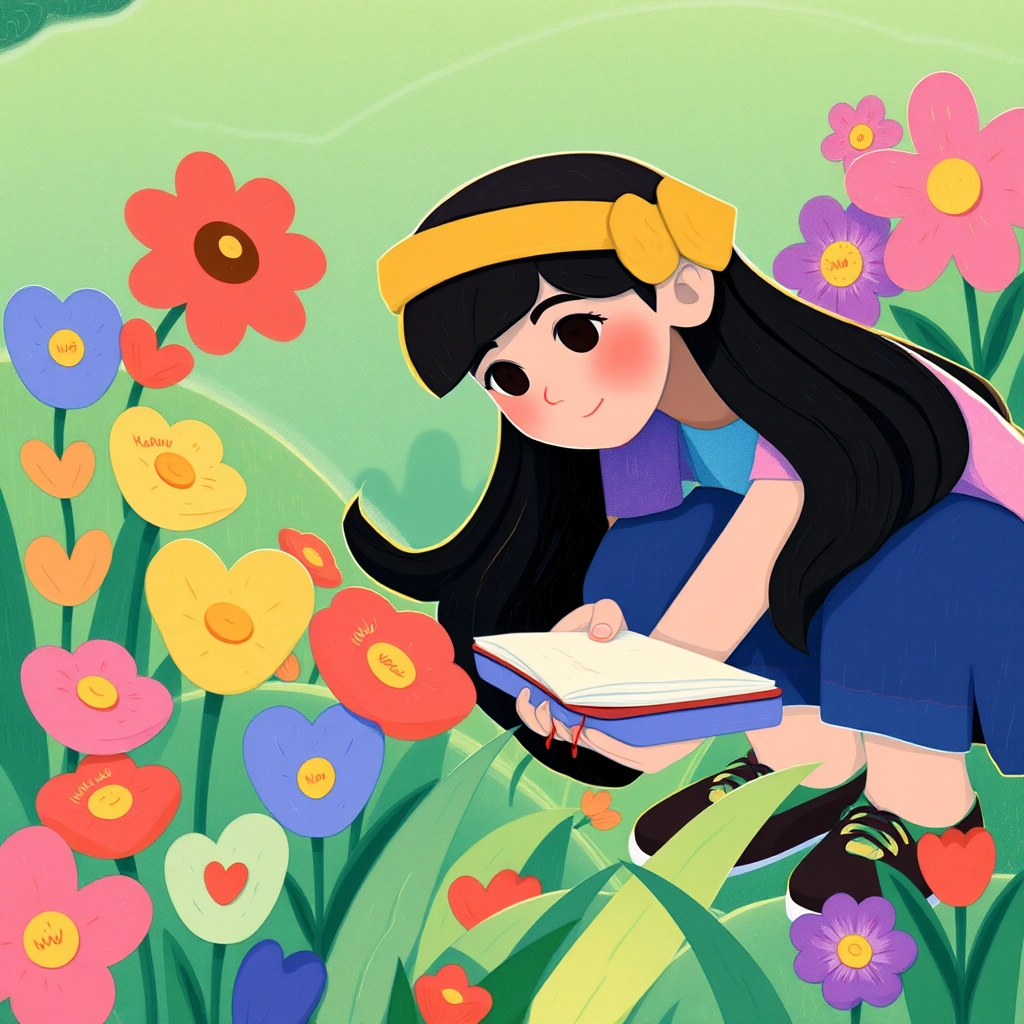 She leaned closer and heard the flowers softly whisper a message. They told her to follow the path of golden leaves to discover more wonders.