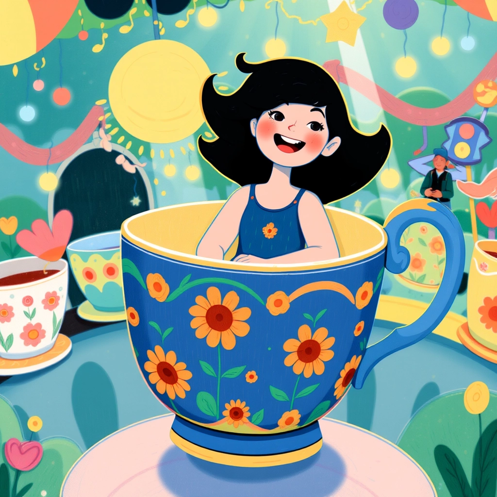 Her first stop was the tea cup ride. [Alivia](SG4SSQSQ) spun so fast she felt like a whirlwind!