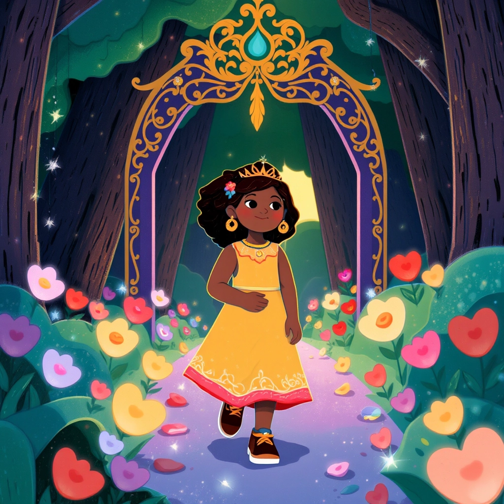 Excitedly, [Allahna](TVKPXNT6) followed the butterfly through a trail lined with blooming flowers that seemed to glow brighter as she walked past. Soon, she arrived at a giant golden arch shimmering with magical sparkles.