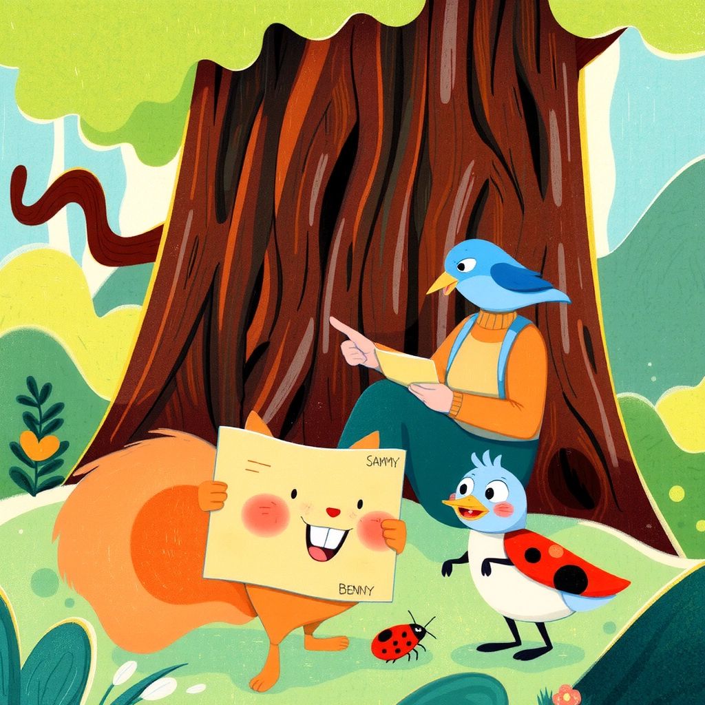 One sunny morning, [Sammy](SLJ6LWMM) and [Lila](2DLSVZX3) heard an excited chirping from a nearby tree. It was [Benny](NMDDPTS6) the bluebird, who had discovered a hidden map!