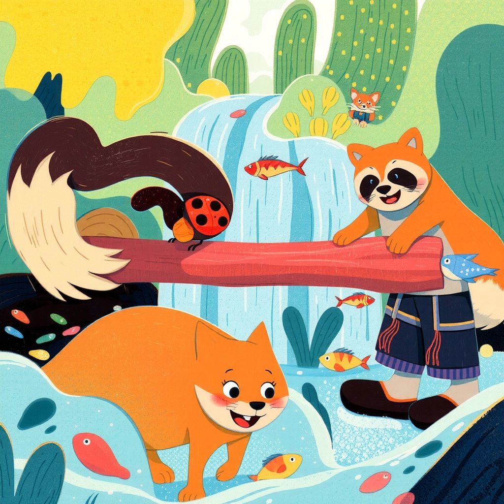 Along the way, they encountered a rushing river. [RJ](YYX9RY5G) the raccoon helped them build a bridge using fallen logs and vines.