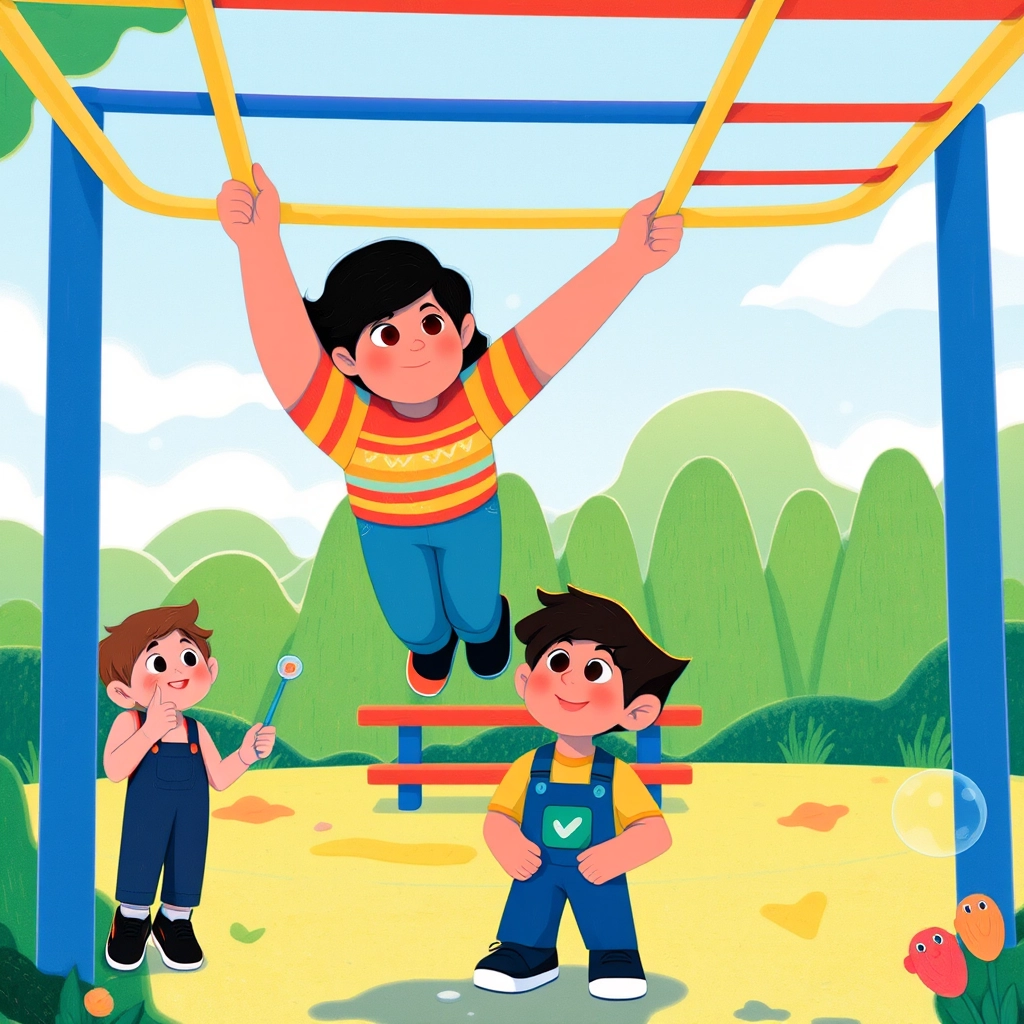 Climbing onto the jungle gym felt like an enormous mountain to [Maya](BZDQ94Z4). Her hands were sweaty, but she pushed herself up one bar at a time. ‘You’re doing amazing!’ her mom cheered from below.
