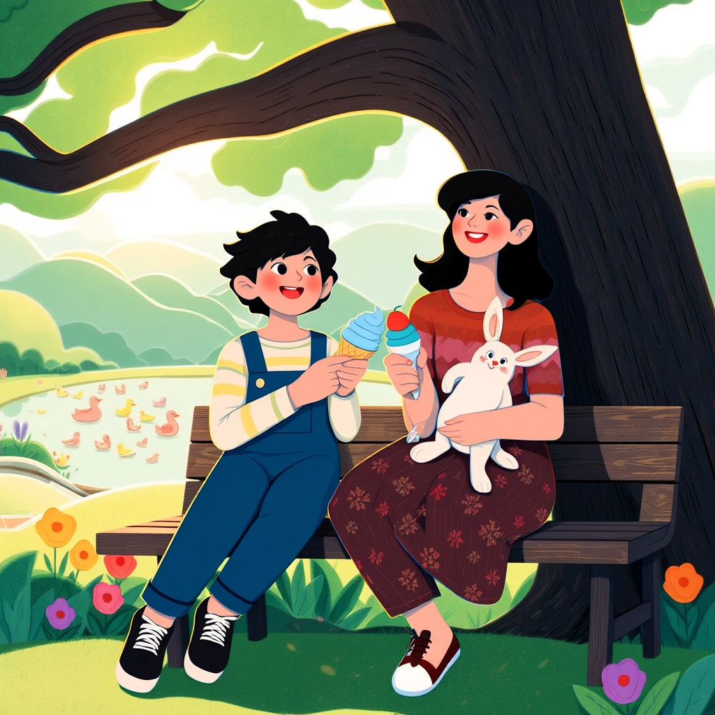Later, [Maya](BZDQ94Z4) and her mom sat on a bench to enjoy ice cream. [Maya](BZDQ94Z4)’s was blueberry, her favorite! ‘You were so brave today,’ her mom said. [Maya](BZDQ94Z4) smiled and nodded. She felt really proud.