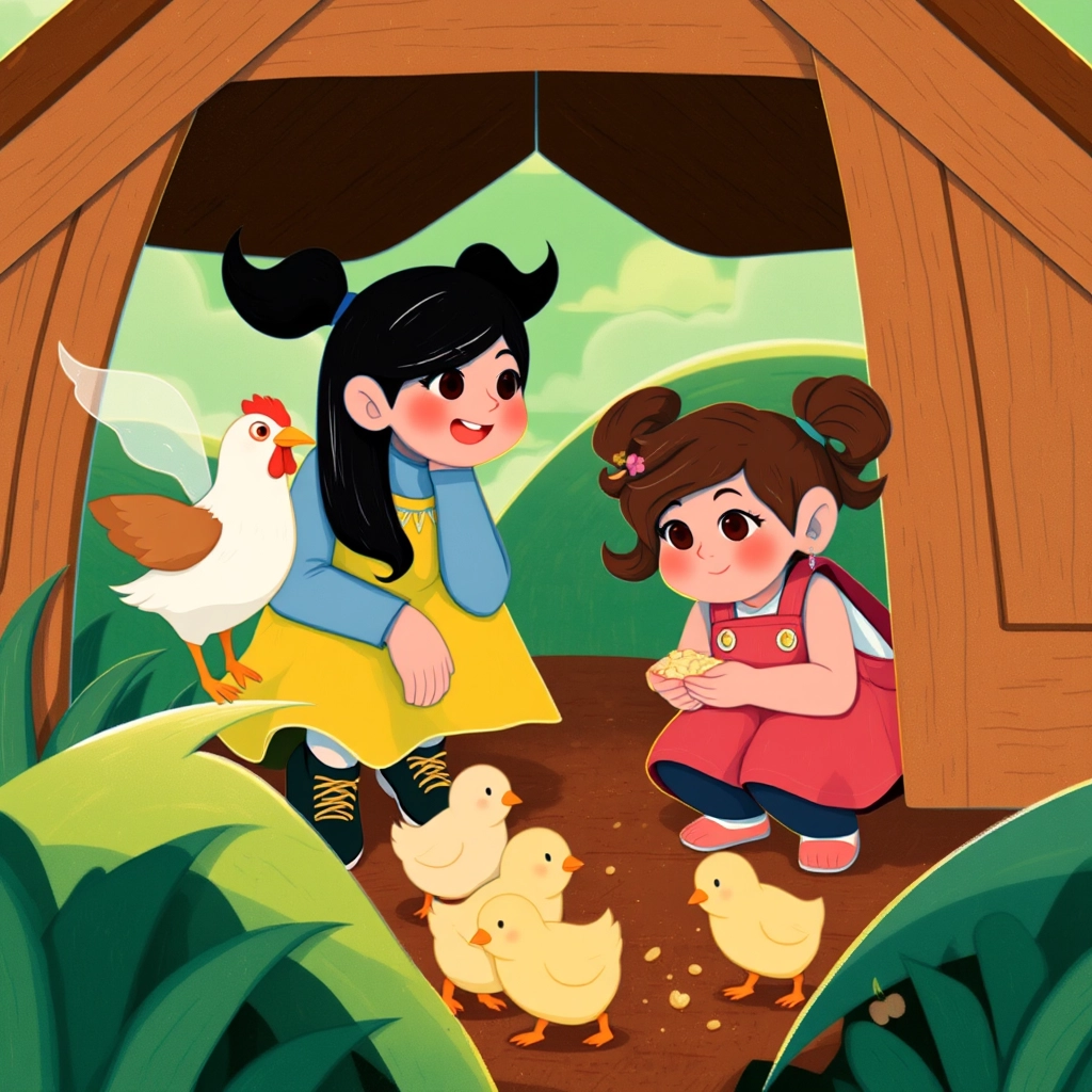 First stop was the chicken coop. [Amora](NMLVF9ZG) giggled as a hen brushed past her leg. [Ellani](5GQVVBHJ) curiously watched the baby chicks peck at the ground. 'Can we feed them?' she asked.