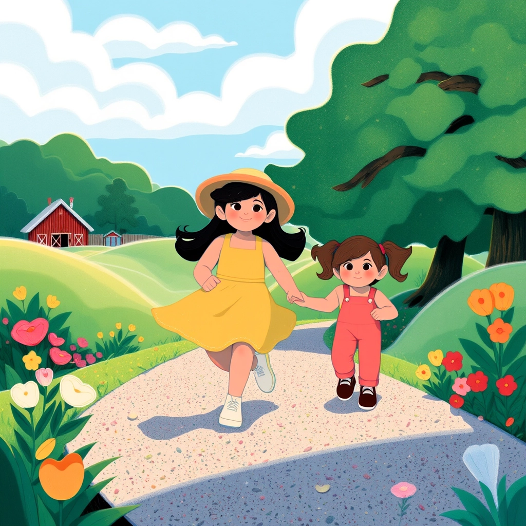 One sunny morning, [Amora](NMLVF9ZG) and [Ellani](5GQVVBHJ) woke up excited. Today, they were going to visit their uncle's farm! With picnic baskets in hand, they ran out the door, eager to see the animals and help with chores.