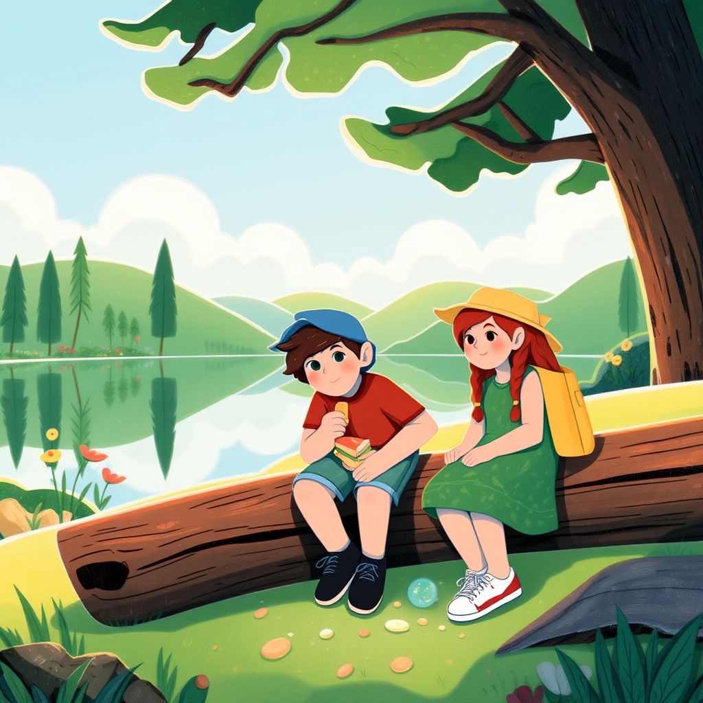 Halfway around the lake, they stopped at a clearing with a breathtaking view. The lake sparkled in the sunlight, reflecting clouds, trees, and birds. They sat on a log to enjoy their snacks. Suddenly, [Greta](S2LP95HW) spotted something shiny near the log.