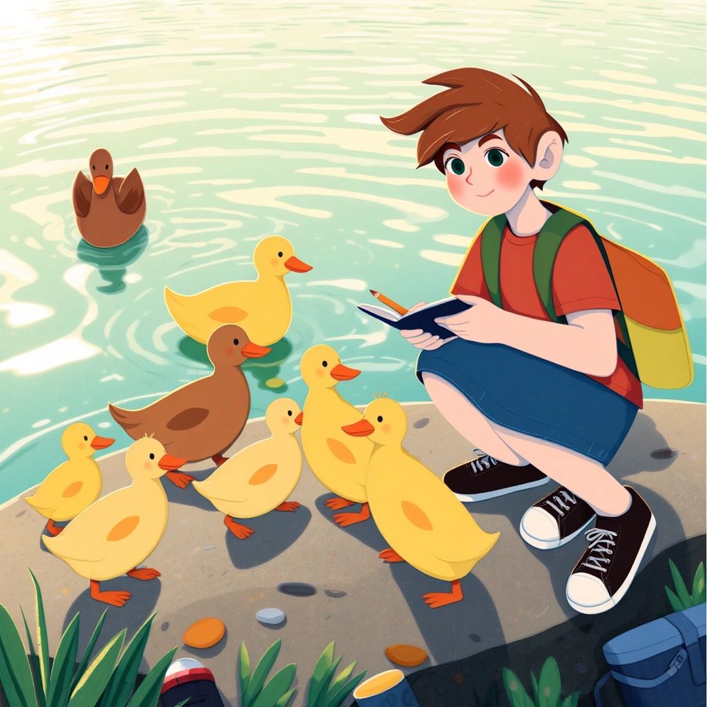 As they started walking, they noticed a family of ducks waddling toward the water. [Greta](S2LP95HW) giggled, 'Look at the ducklings! They're so tiny!' [Ben](LQ4TM3CJ) took out a notebook to sketch the ducks, while [Greta](S2LP95HW) pretended to chat with them.