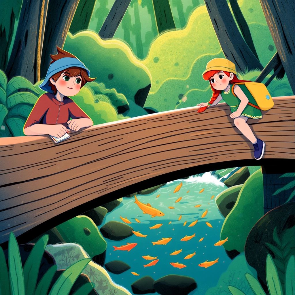 Soon, they reached a wooden bridge over a small stream. They leaned over and saw tiny fish darting around in the clear water. 'Hello, fishies!' [Greta](S2LP95HW) whispered. 'What do you think they’re saying to each other?' [Ben](LQ4TM3CJ) wondered aloud.