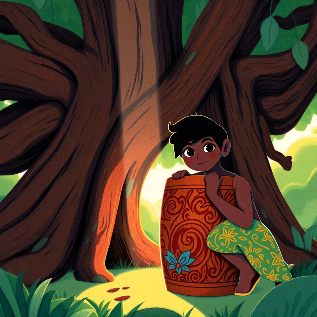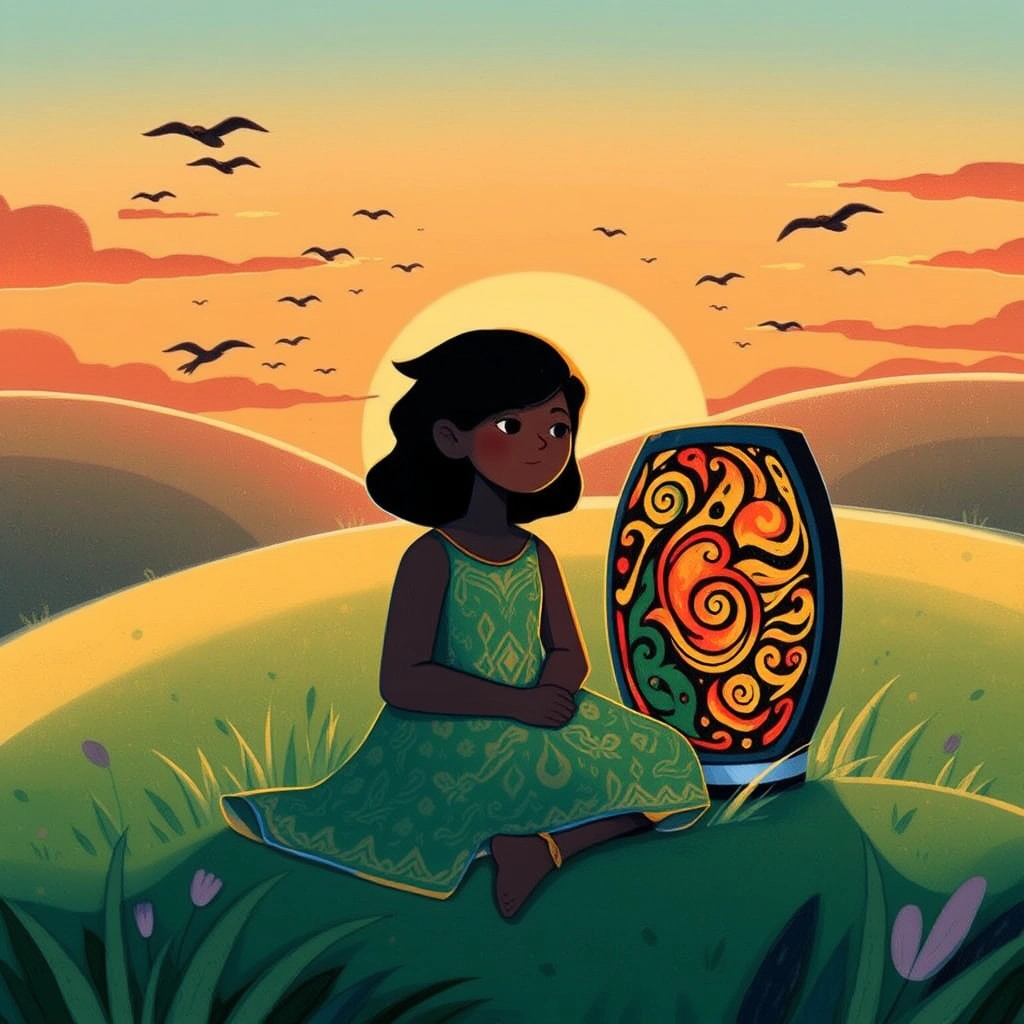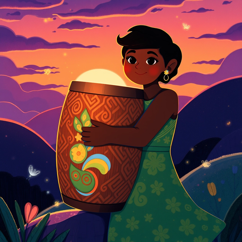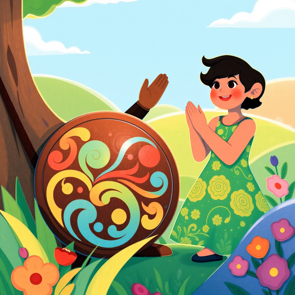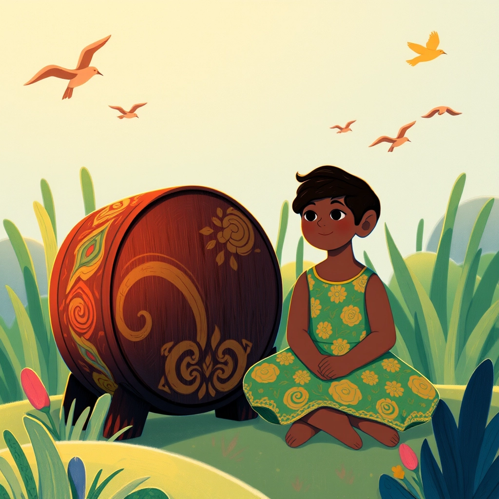One day, while playing near her grandmother's hut, [Anya](FLPMNCF3) spotted a beautiful drum sitting under an old baobab tree. Its swirling patterns seemed alive, shimmering faintly in the sun.