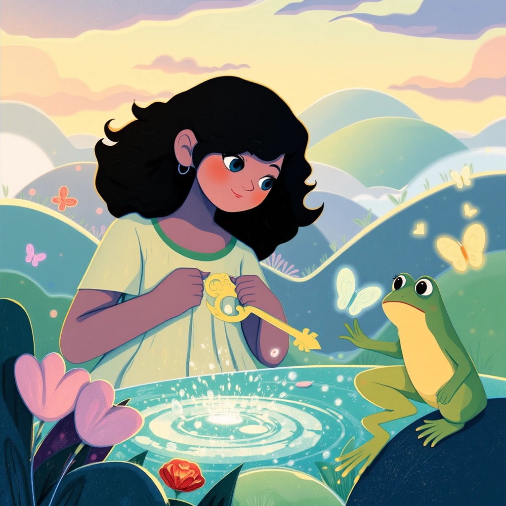 The path took her to a tiny sparkling pond, where a talking frog sat on a lilypad. 'Welcome, [Aradheya](Q9H7YYNN),' croaked the frog. 'You’ve taken the first step to protect the magic of our land. But we need your courage for the challenges ahead.'