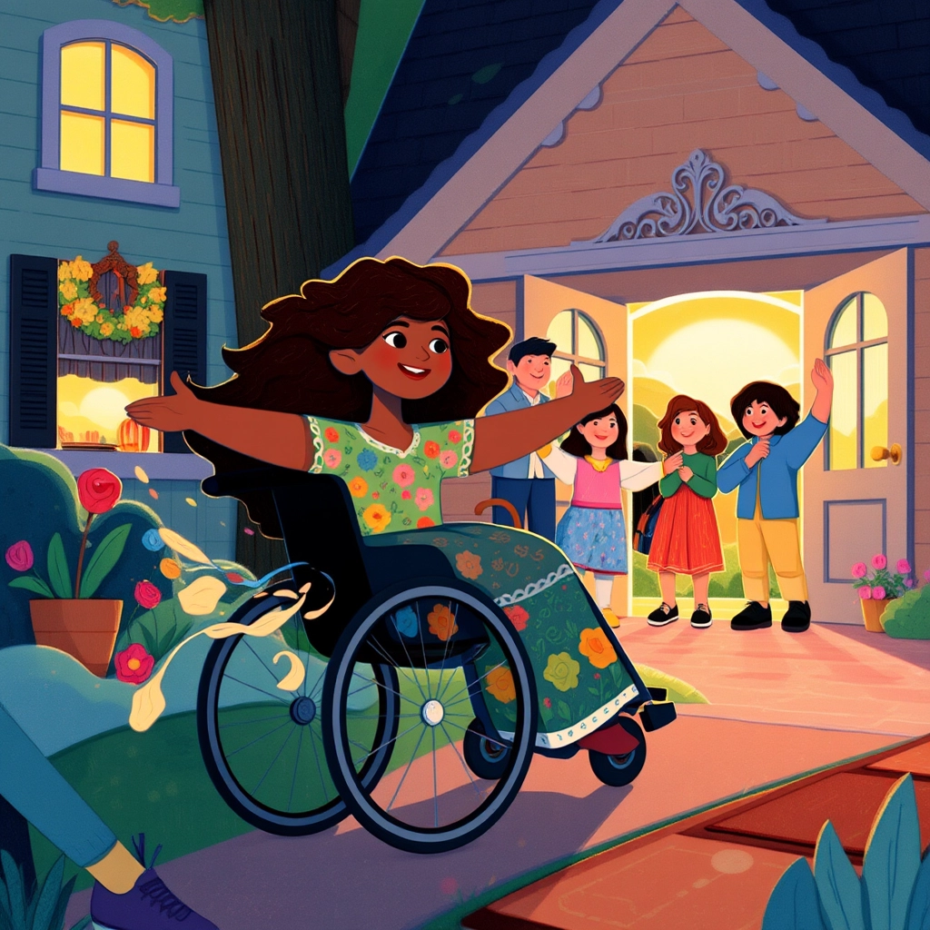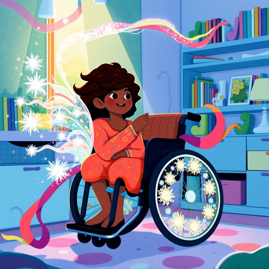 The next morning, [Arellia](SYFDS9C2) woke to find her wheelchair transformed! Its wheels shimmered like silver, and colorful ribbons danced behind it as she moved. She knew her dream had come true!
