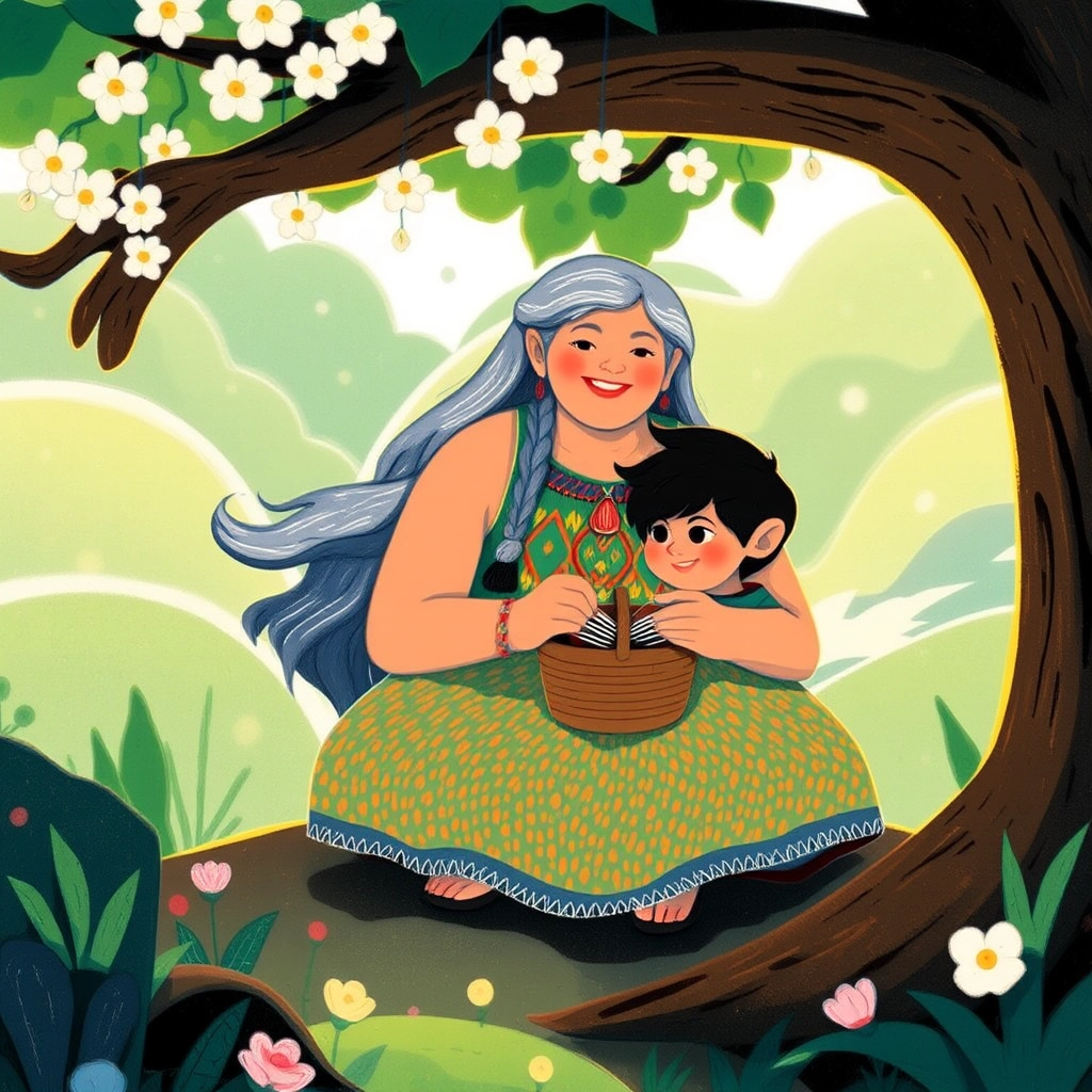 [Nanny](5V4XMCQ6), wearing her bright Piu Piu skirt, was teaching the kids how to weave a Kete bag under the shade of a Manuka tree.