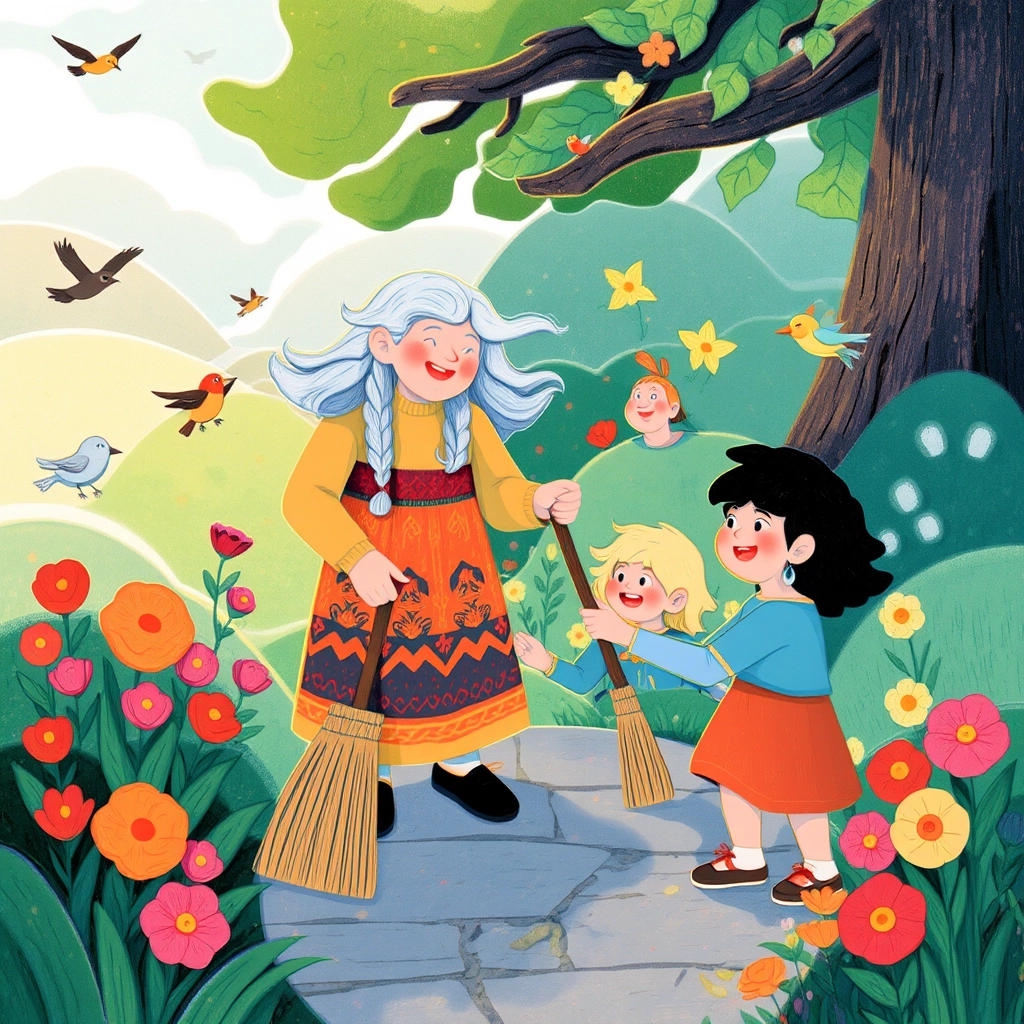 Next up was [Nanny](5V4XMCQ6)’s lesson. ‘Let’s learn how to sweep the paths with these traditional Manuka brooms,’ she said, handing them out.