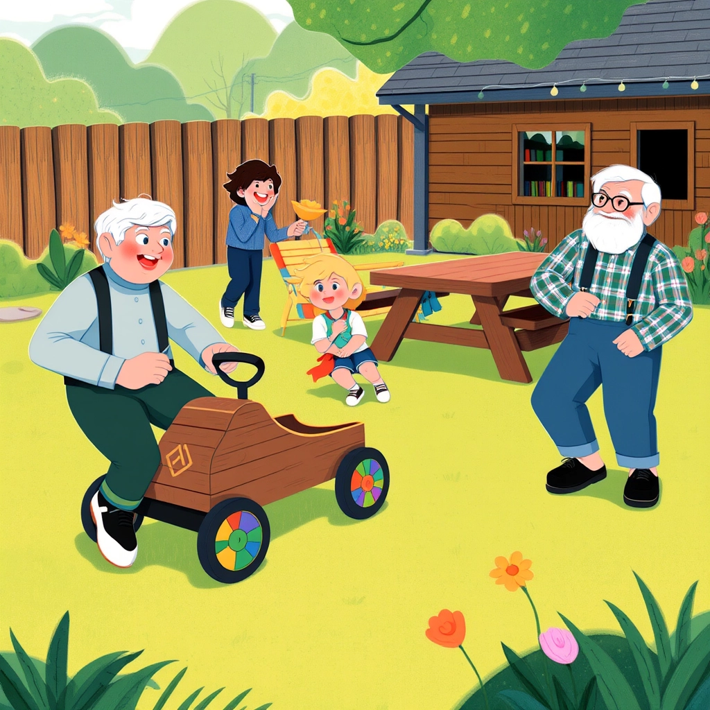 ‘Time for some go-carting fun!’ [Granddad](DT7XCT9W) cheered. He had turned an old cart into a speedy ride, which zoomed along the winding backyard paths.