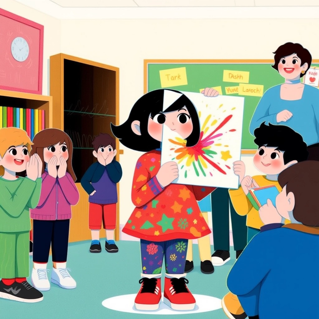 One day, [Ashi](7MJHGPHP) amazed everyone by standing up in class and giving her very first presentation. Her friends clapped loudly, and her teacher gave her a big thumbs-up.