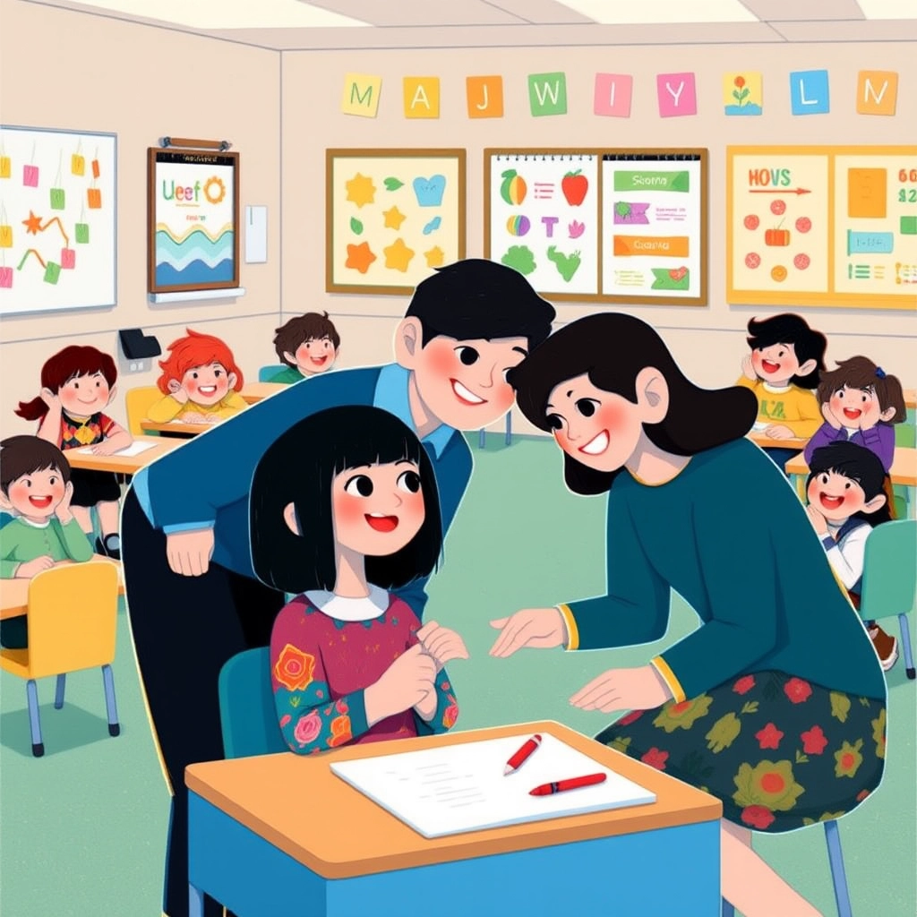 At school, [Ashi](7MJHGPHP) had teachers who were kind and patient. Slowly, she learned how to talk more and explain what she needed. She tried her hardest every day, and her teachers cheered for her progress.